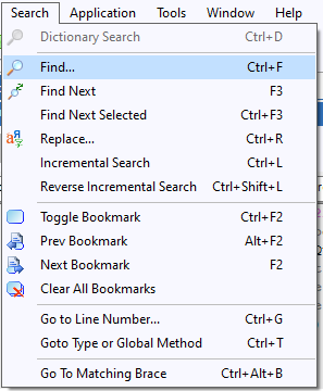 The text we want to find is "ThisWindow.Init", so type it in to the "Find what" field and click the "Find" button. Click on the red "x" to close the Find dialog. You should see "ThisWindow.Init" highlighted on the screen.